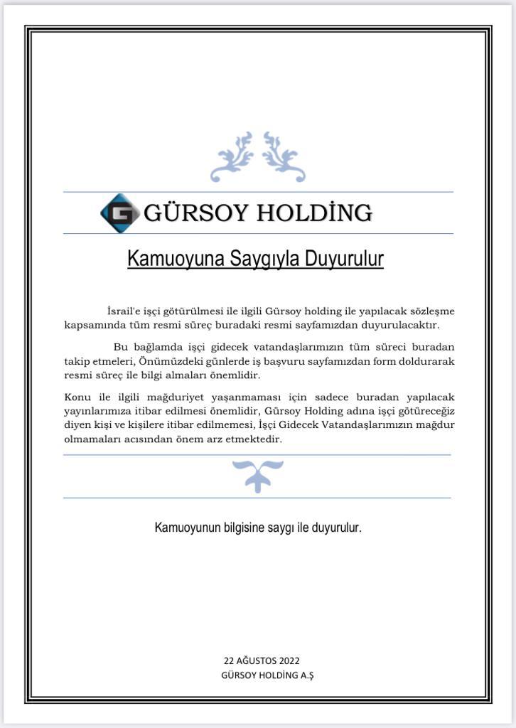 GÜRSOY HOLDİNG kuruluşundan günümüze kadar kalite ve istikrar politikalarını gözeterek yapmış olduğu başarılı çalışmalarla inşaat sektöründe kökleşmiş örnek bir firmadır. Özellikle konut ve taahhüt işlerinde konusunda uzmanlaşmış ve bugün Türkiye’de inşaat sektörünün önde gelen firmalarından biri olmuştur. Firmamız kurulduğu günden bu güne kadar genel olarak konut ve iş merkezleri inşaatı, kamu sektöründe okul,yurt,hastane ve yol yapım taahhütleri gibi alanında uzmanlık isteyen çalışmalar için sonsuz özverisini günümüz teknolojisiyle birleştirerek mükemmel bir altyapı oluşturmuş böylelikle günümüz koşullarına uygun, rahatlığın ve konforun hissedildiği alanlar yaratmıştır.